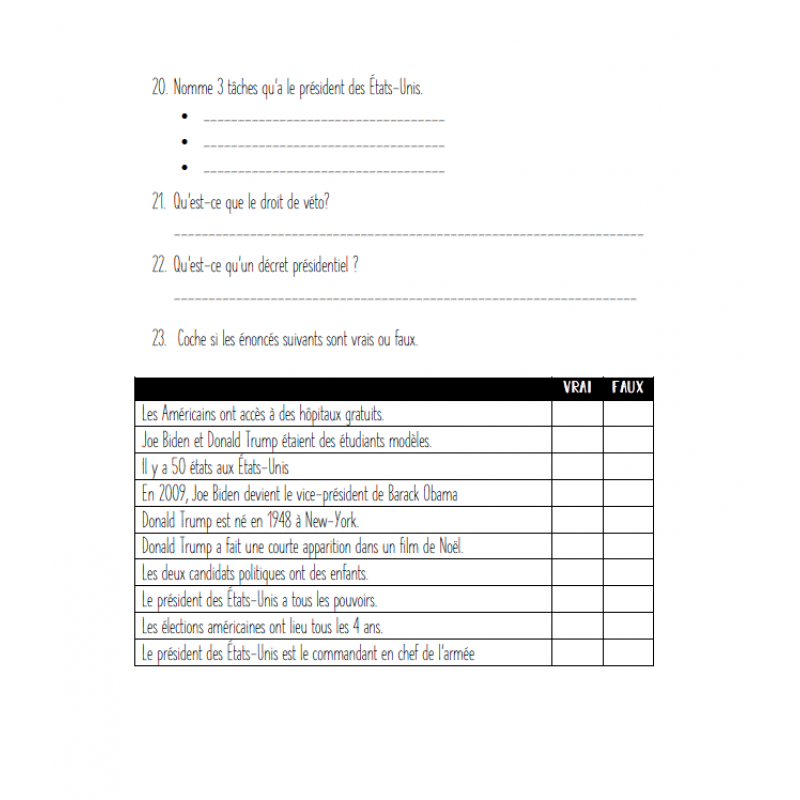 Questionnaire de 4 pages pour accompagner l'article sur les élections américaines.