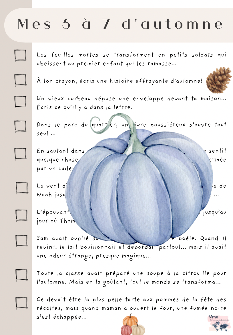 L’automne est là avec ses couleurs chaudes, ses promenades dans les feuilles qui craquent sous les pas et ses moments doux au coin d’une couverture. Ce document regroupe plusieurs petites écritures inspirées de cette saison magique : des histoires courtes, des débuts d’aventures et des idées créatives qui sentent la cannelle et les pommes. De quoi éveiller l’imagination, réchauffer les cœurs et donner envie d’écrire en regardant tomber les feuilles.