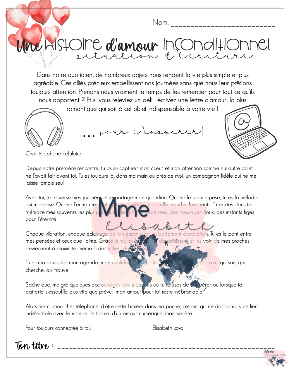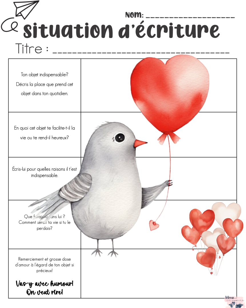 Situation d'écriture loufoque! L'élève doit écrire une lettre d'amour à un objet précieux dans sa vie!