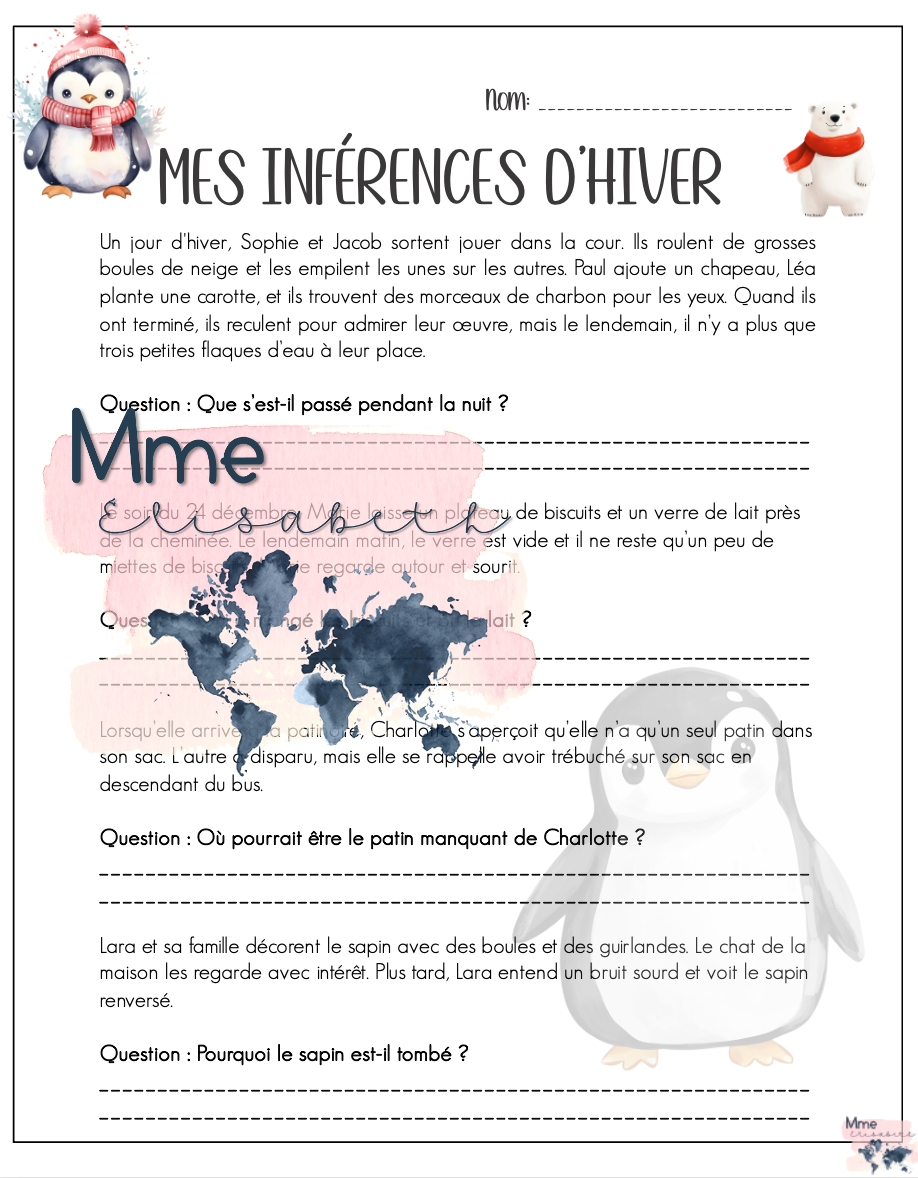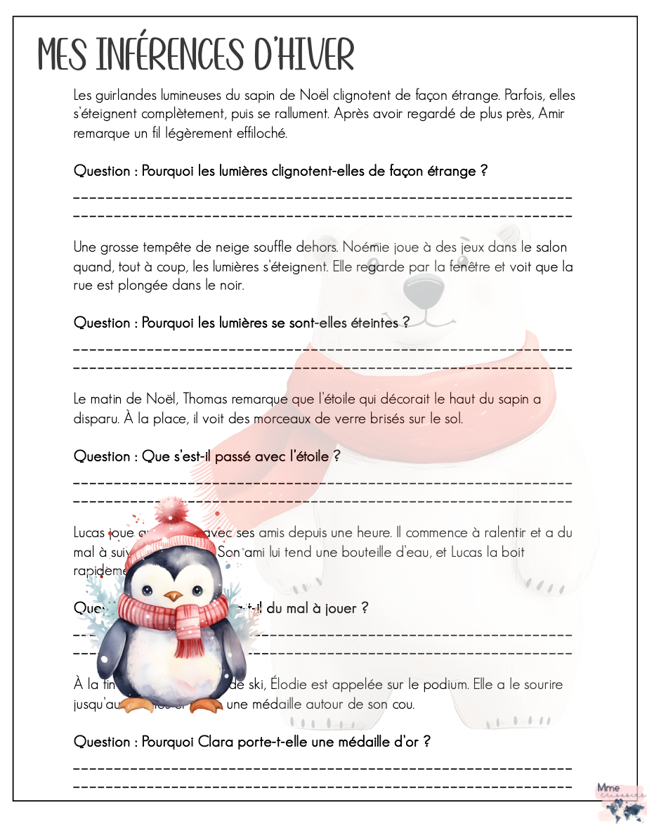 3 pages de petites inférences hivernales pour travailler la lecture avec vos petits poulets